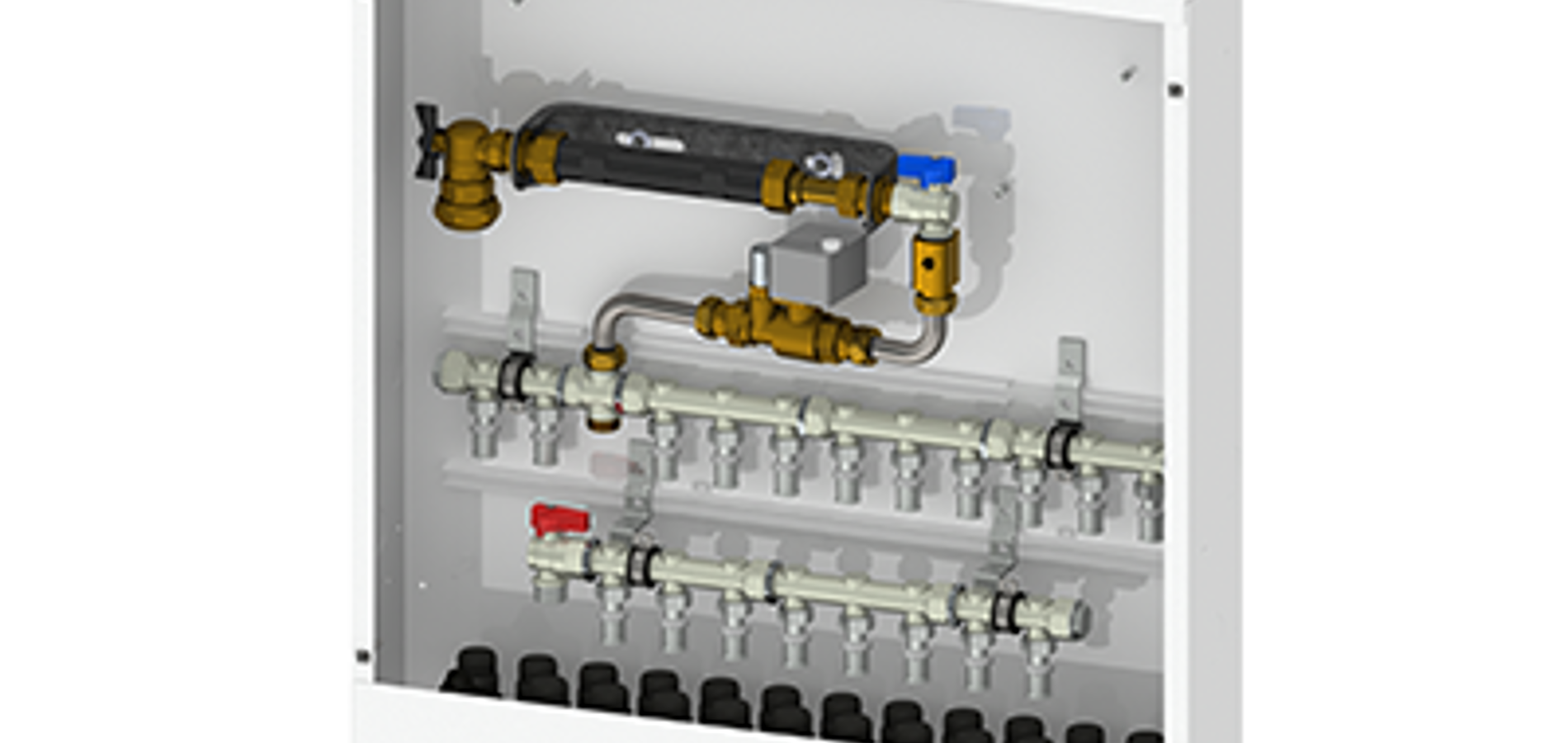 Water meter cabinets are typically used in villas, apartment buildings and apartments where incoming water meters are to be installed. In addition to the water meter console, the water meter cabinets also contain cold water manifolds with up to 11 outlets and hot water manifolds with up to 8 outlets.